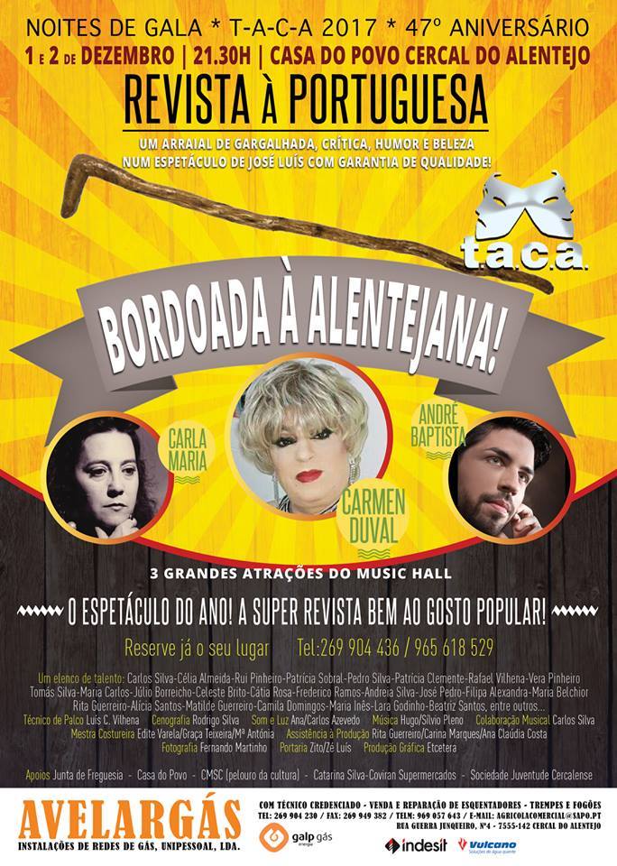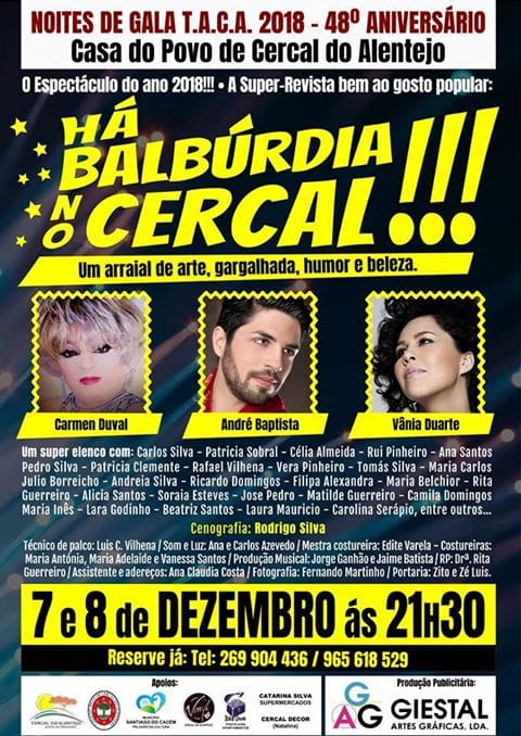 Casa do Povo de Cercal do AlentejoDias 7 e 8 de dezembro, às 21h30, na Casa do Povo de Cercal do Alentejo o TACA - Teatro Amador do Cercal do Alentejo, apresenta o Teatro de Revista - Há Balbúrdia no Cercal! com a participação de Camen Duval, André Baptista e Vânia Duarte.