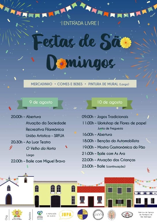 São Domingos Rua Escritor Manuel da Fonseca, PortugalTeatro, pintura mural, atuação da Banda da Sociedade Filármonica União Artística de Santiago do Cacém, bailes, jogos tradicionaios e uma mostra gastronómica do pão são as propostas da programação das Festas em São Domingos, nos dias 9 ( a patrir das 20h00) e 10 (a partir das 09h00) de agosto. As entradas são livres!