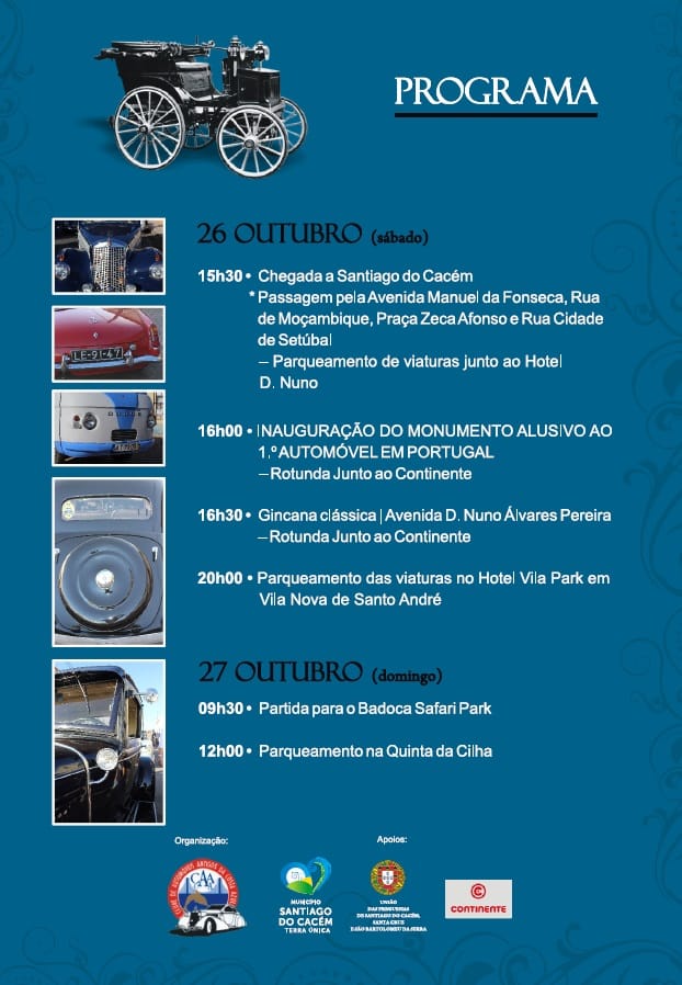 No dia 26 de outubro realiza-se, pelas 16h00, a inauguração do monumento alusivo ao 1.º automóvel em Portugal, na rotunda na Avenida D. Nuno Álvares Pereira, junto ao hipermercado Continente, em Santiago do Cacém. O momento será, também, marcado pela tradicional recriação desta fantástica viagem que aconteceu há 124 anos. Trata-se da XXV Viagem Histórica uma iniciativa organizada pelo Clube de Automóveis Antigos da Costa Azul, com o apoio da Câmara Municipal de Santiago do Cacém e da União de Freguesias de Santiago do Cacém, Santa Cruz e São Bartolomeu da Serra.
